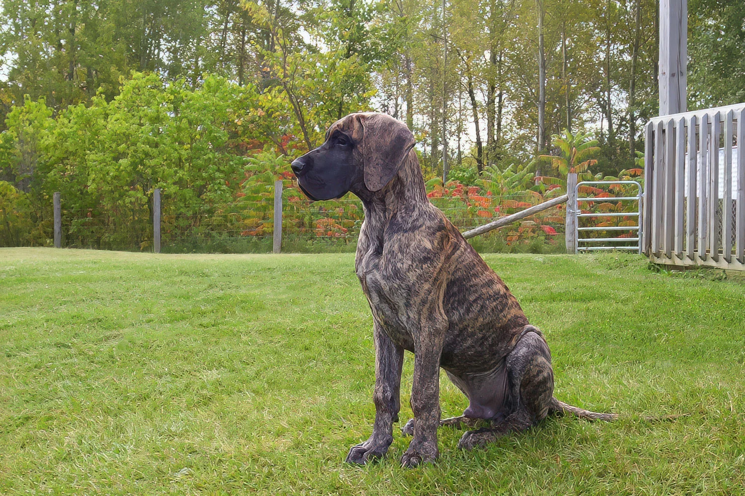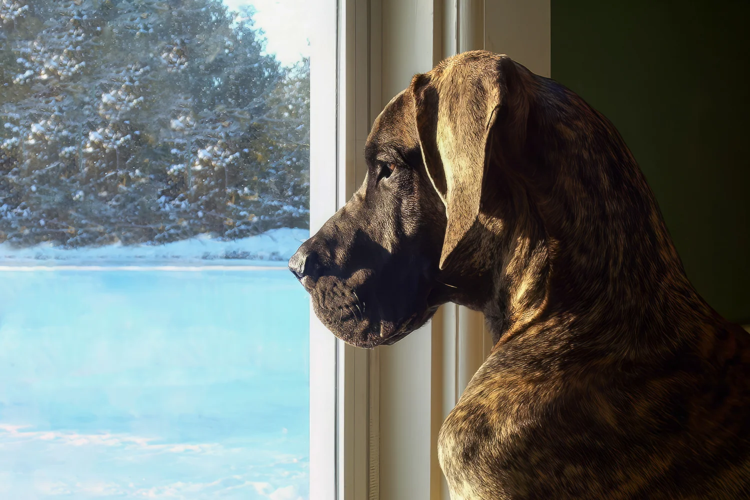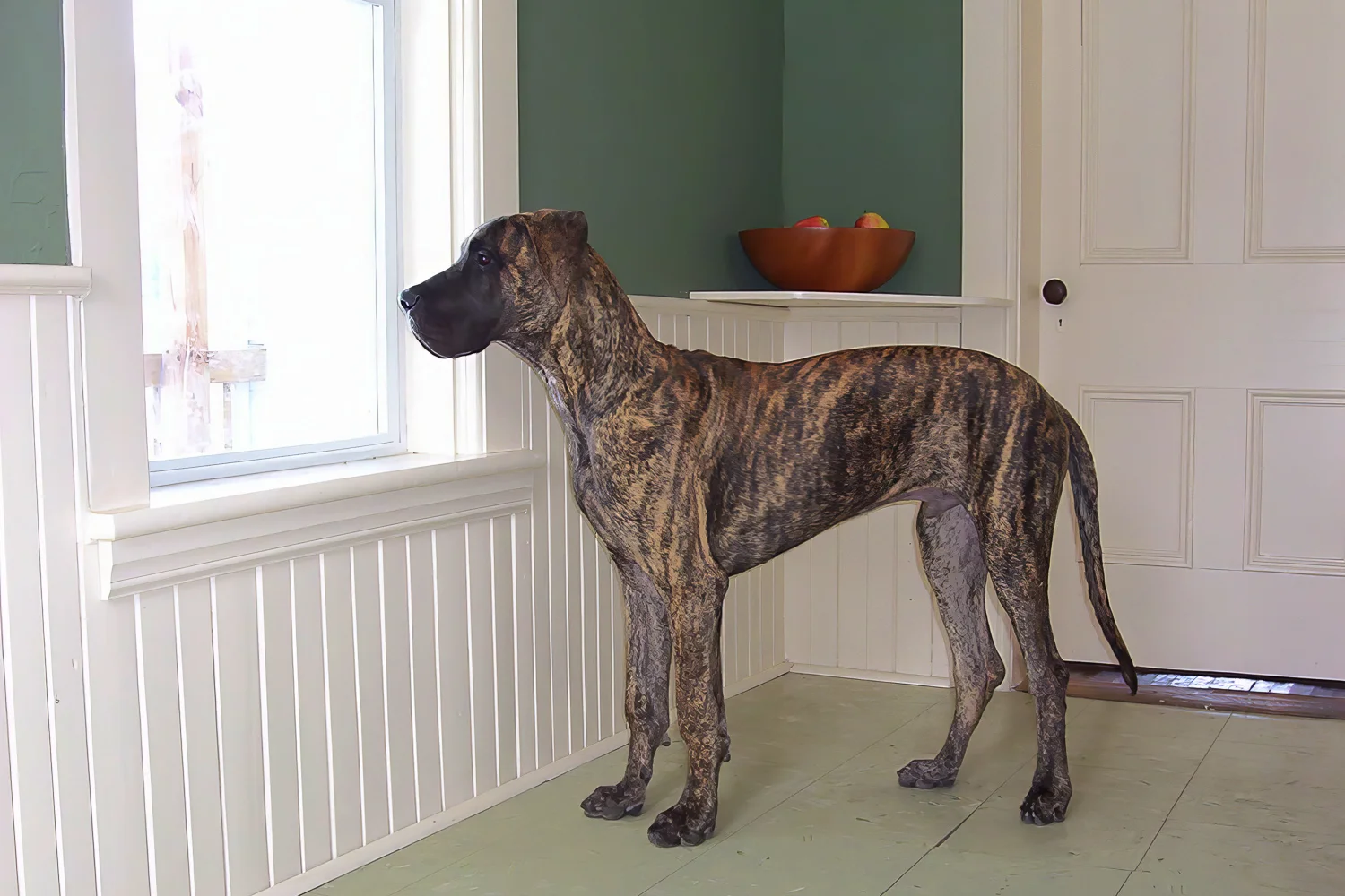 When Elliott was nine months old, his meagre confidence began to wane, and by one year of age, it was nothing but a memory. Elliott was a timid Dane, fearful of men, children, and small dogs. Elliott’s passion was women. He was a shameless flirt and never met a woman he couldn’t woo. At 12 months of age, Elliott stood 36 inches (91 cm) at the shoulder. He quickly realized that cleavage made an excellent chin rest, the kitchen sink was the perfect water bowl, and all laps were a personal invitation to sit.